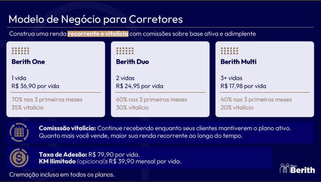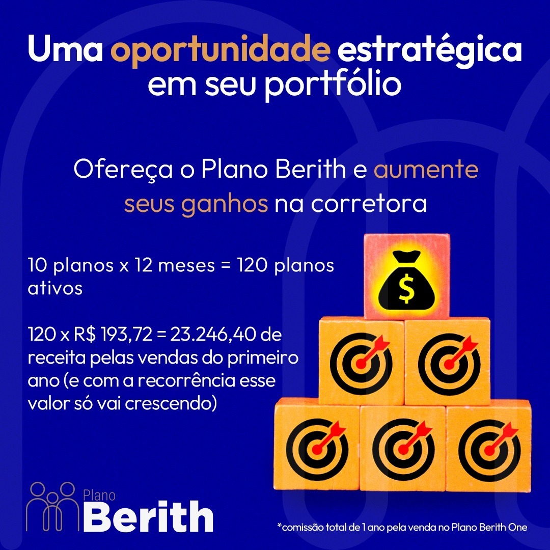 A lógica comercial se baseia na construção progressiva de carteira. Um exemplo apresentado pela própria Berith ilustra esse potencial: um corretor que venda dez planos por mês poderá acumular 120 contratos ativos ao final de um ano. Nesse cenário, a receita gerada pelas vendas do primeiro ano pode alcançar cerca de R$ 23.246,40, considerando a estrutura de comissionamento inicial.